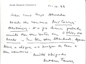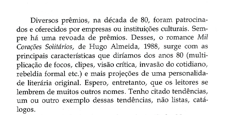 Com o seu primeiro romance, então inédito, Hugo Almeida conquistou dois prêmios nacionais, o Cidade de Belo Horizonte, em 1987, com o título de Carta de navegação, e o Nestlé em 1988. Inovador na forma, o romance é sobre a solidão de uma mulher casada, Níobe, e de seus filhos. Gamaliel Carvalho é marido e pai distante. Nos anos 1980/90, Mil corações solitários teve três edições pela Scipione. Em 2025, será reeditado pela Sinete.